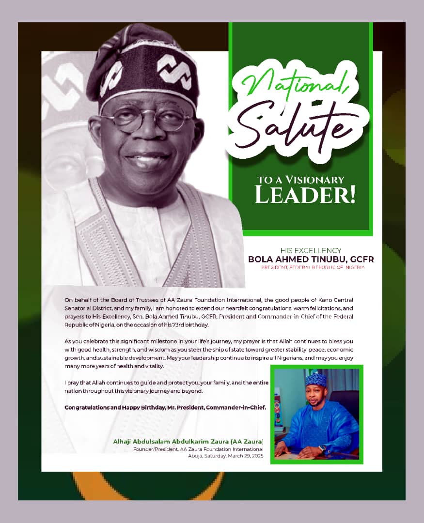 On behalf of the Board of Trustees of AA Zaura Foundation International, the good people of Kano Central Senatorial District, and my family, I am honored to extend our heartfelt congratulations, warm felicitations, and prayers to His Excellency, Sen. Bola Ahmed Tinubu, GCFR, President and Commander-in-Chief of the Federal Republic of Nigeria, on the occasion of his 73rd birthday.